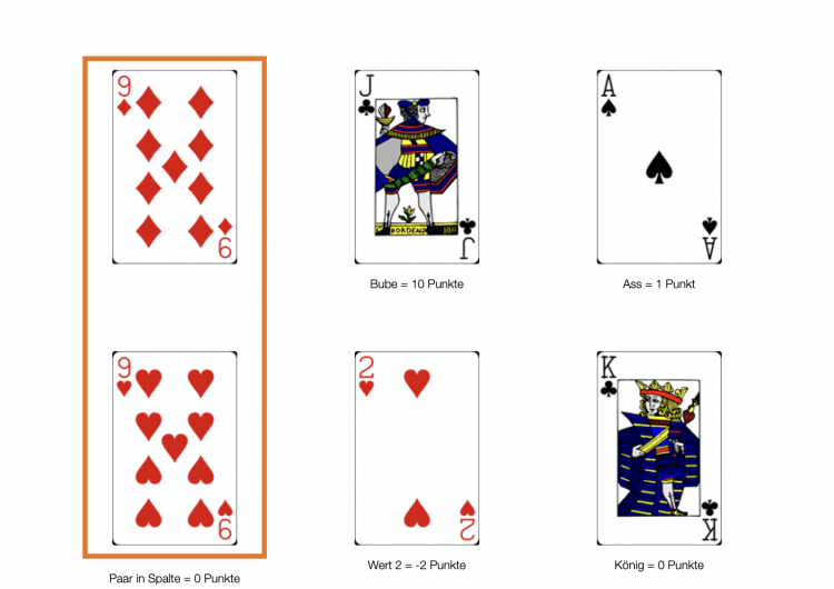 • Gibt es im 2×3-Raster eine Spalte mit Karten (einschließlich Zweien), die denselben Kartenwert haben, werden diese beiden Karten zusammen mit 0 Punkten bewertet.